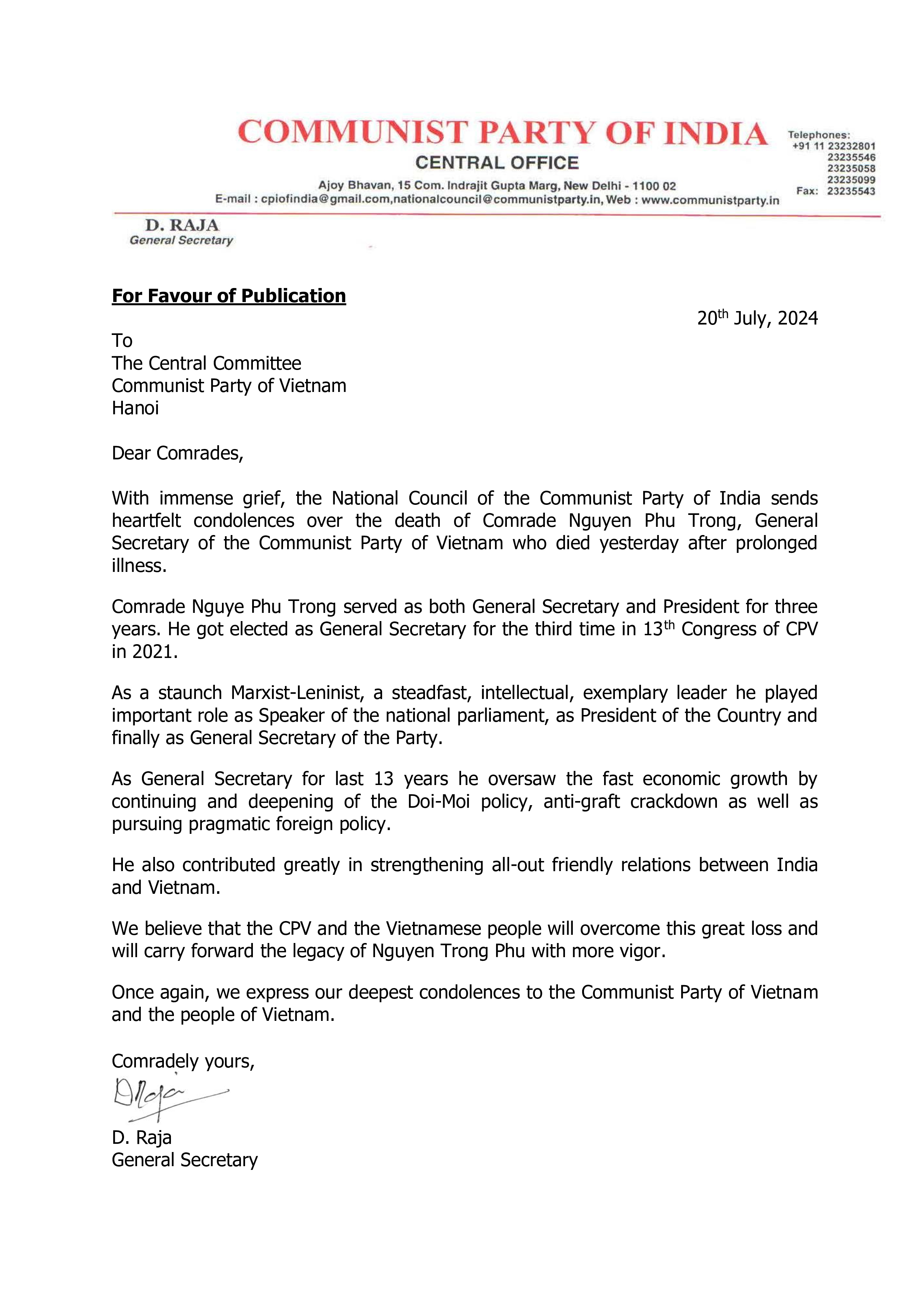 CP of India, condolence message to the Central Committee of the CP of Vietnam